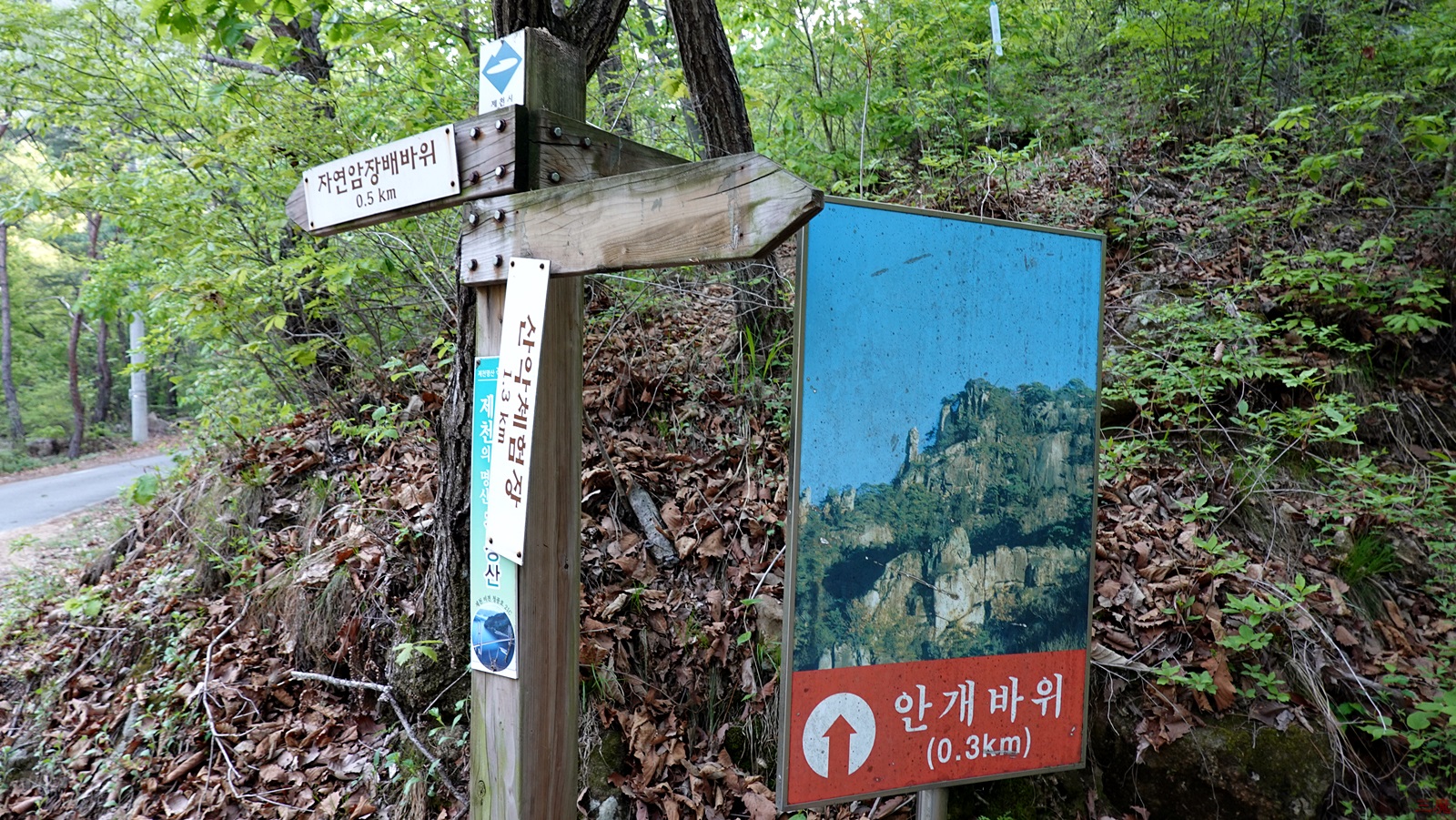 오르다보니, 안개바위 표시가 되어 있는 산행길이 나온다.