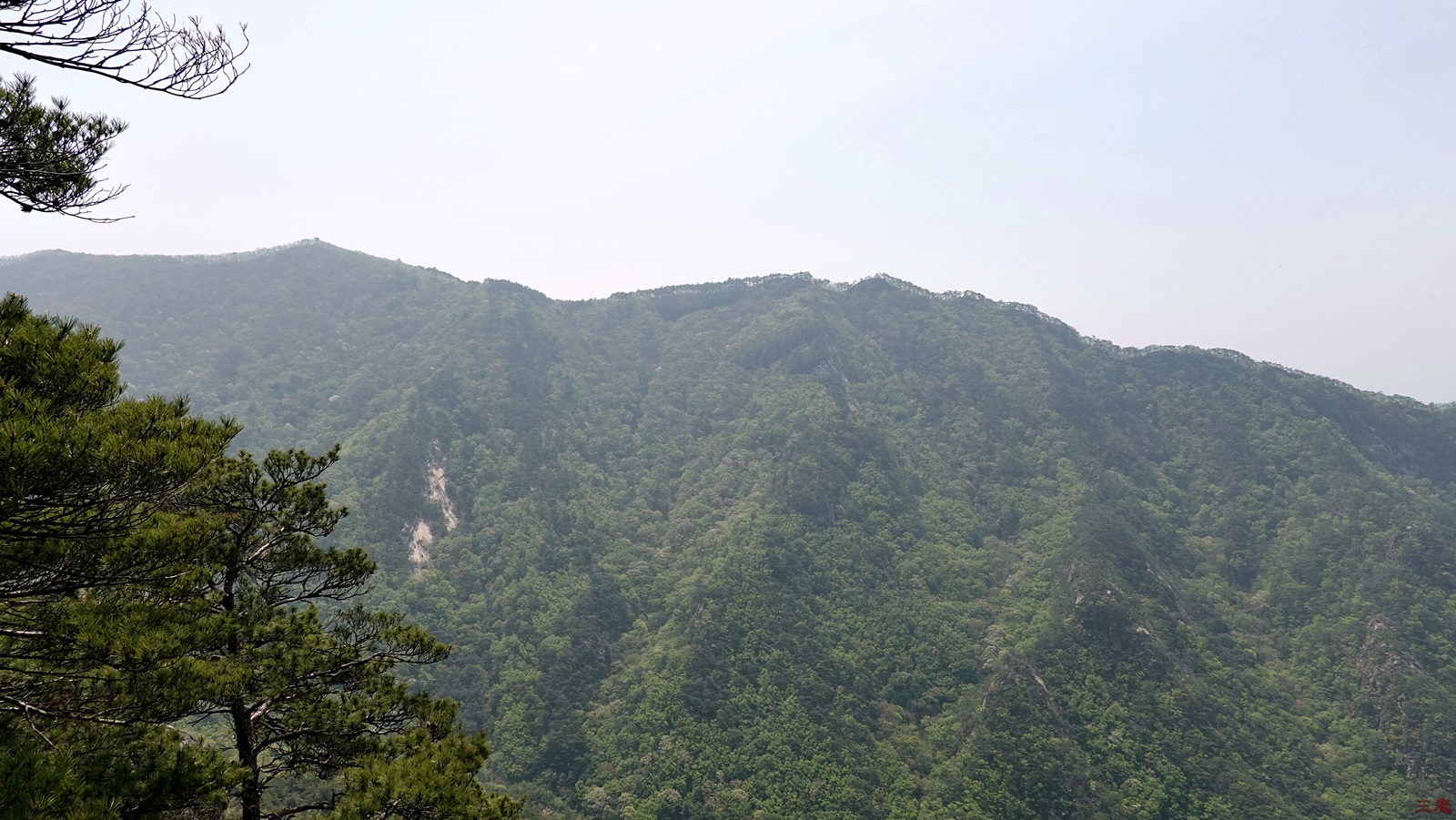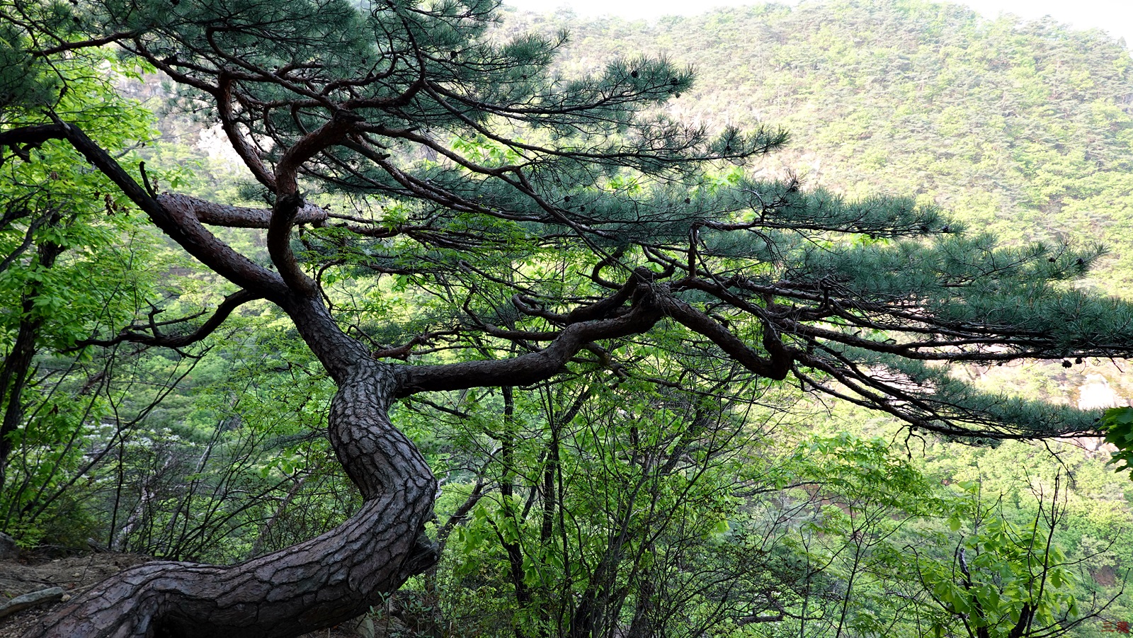 멋진 노송이 있으면서 그 앞에 새로운 산자락 조망이 나타난다.