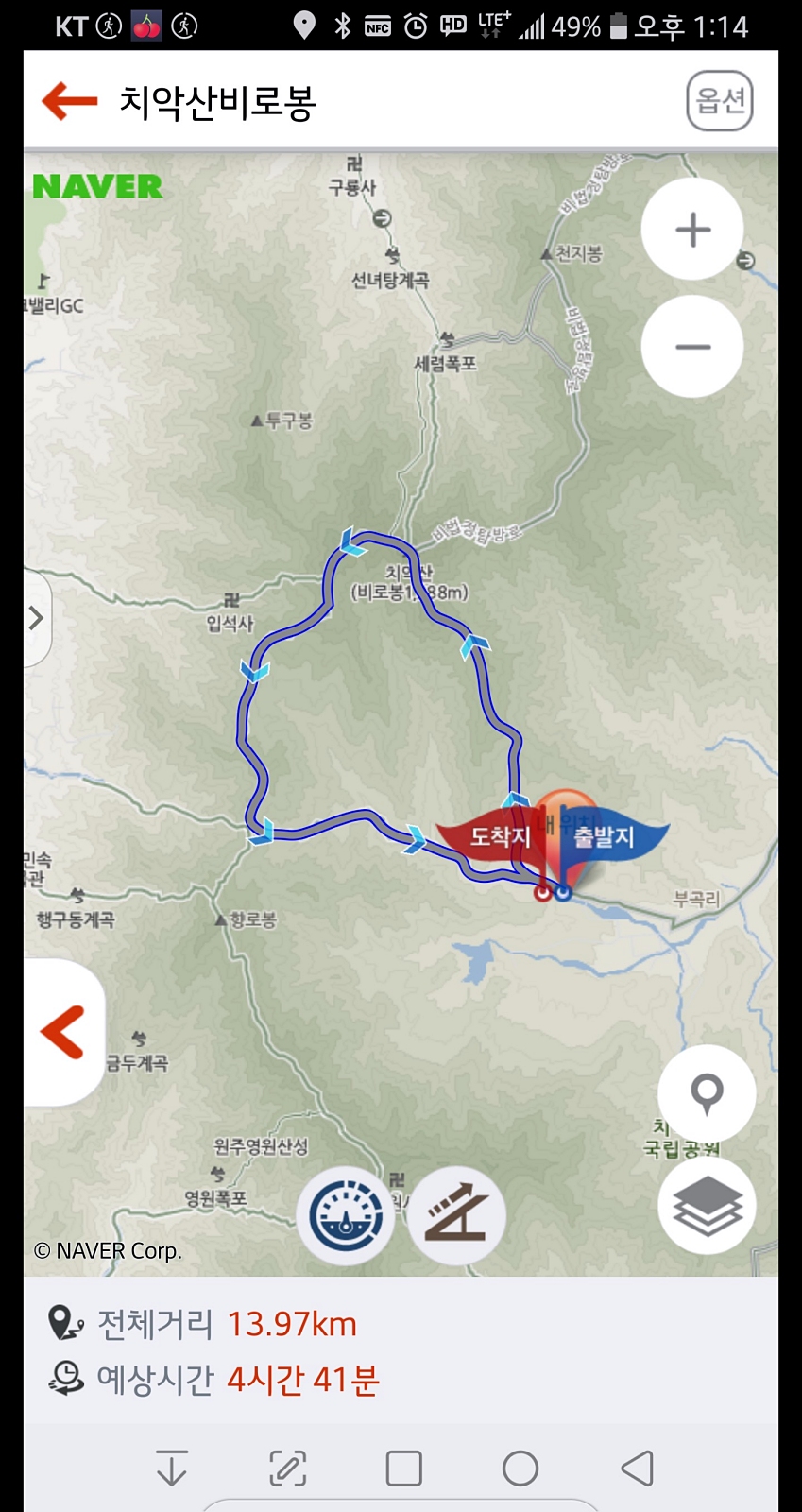 산행코스 : 부곡탐방지원센터~천사봉~비로봉~쥐너미재~곧은재~부곡폭포~부곡탐방지원센터(원점회귀)