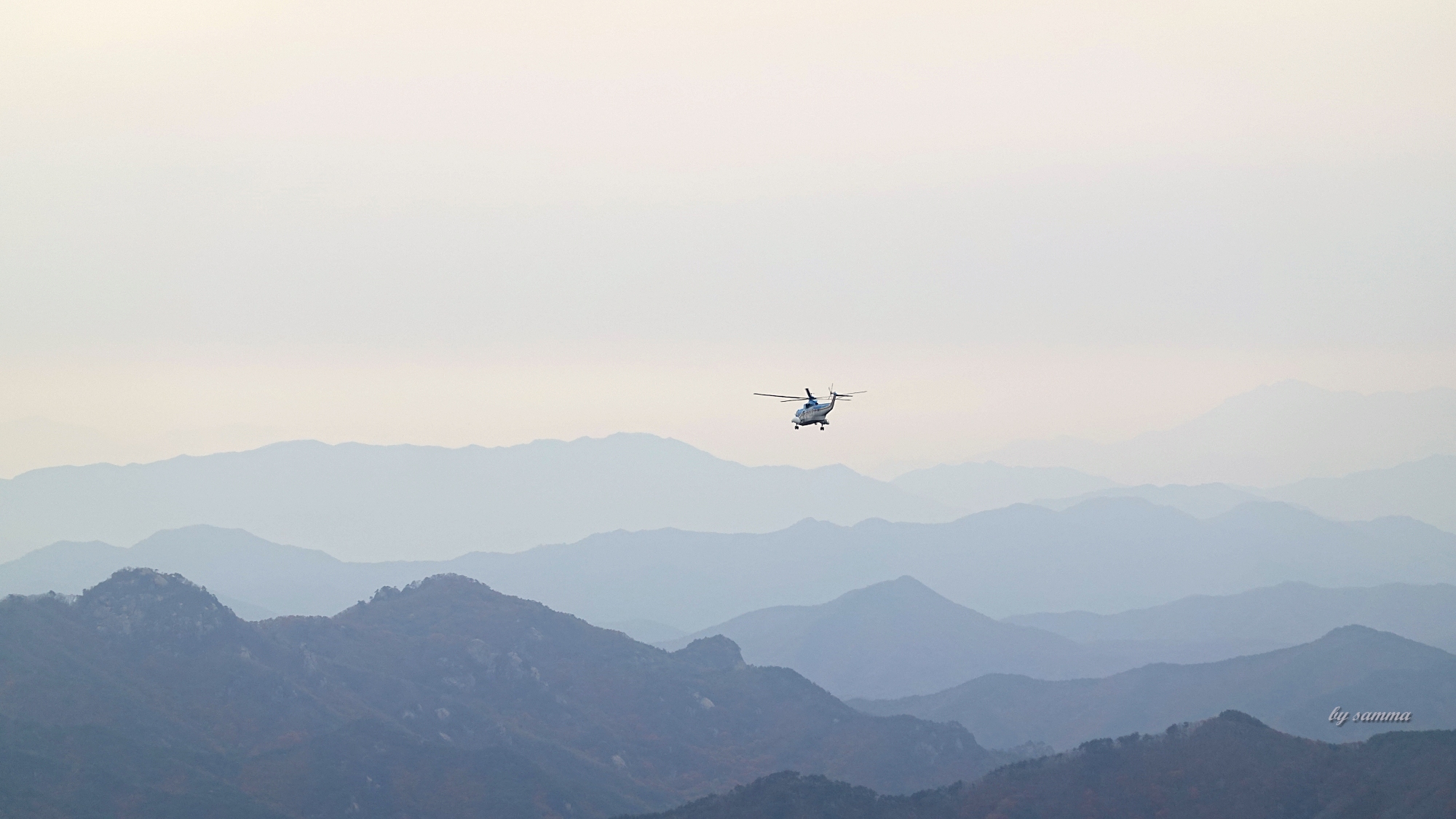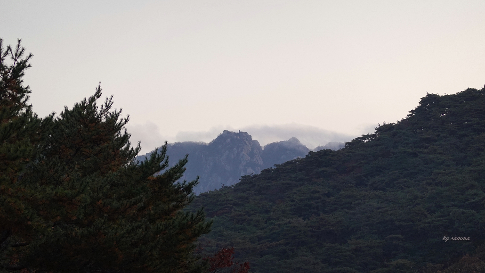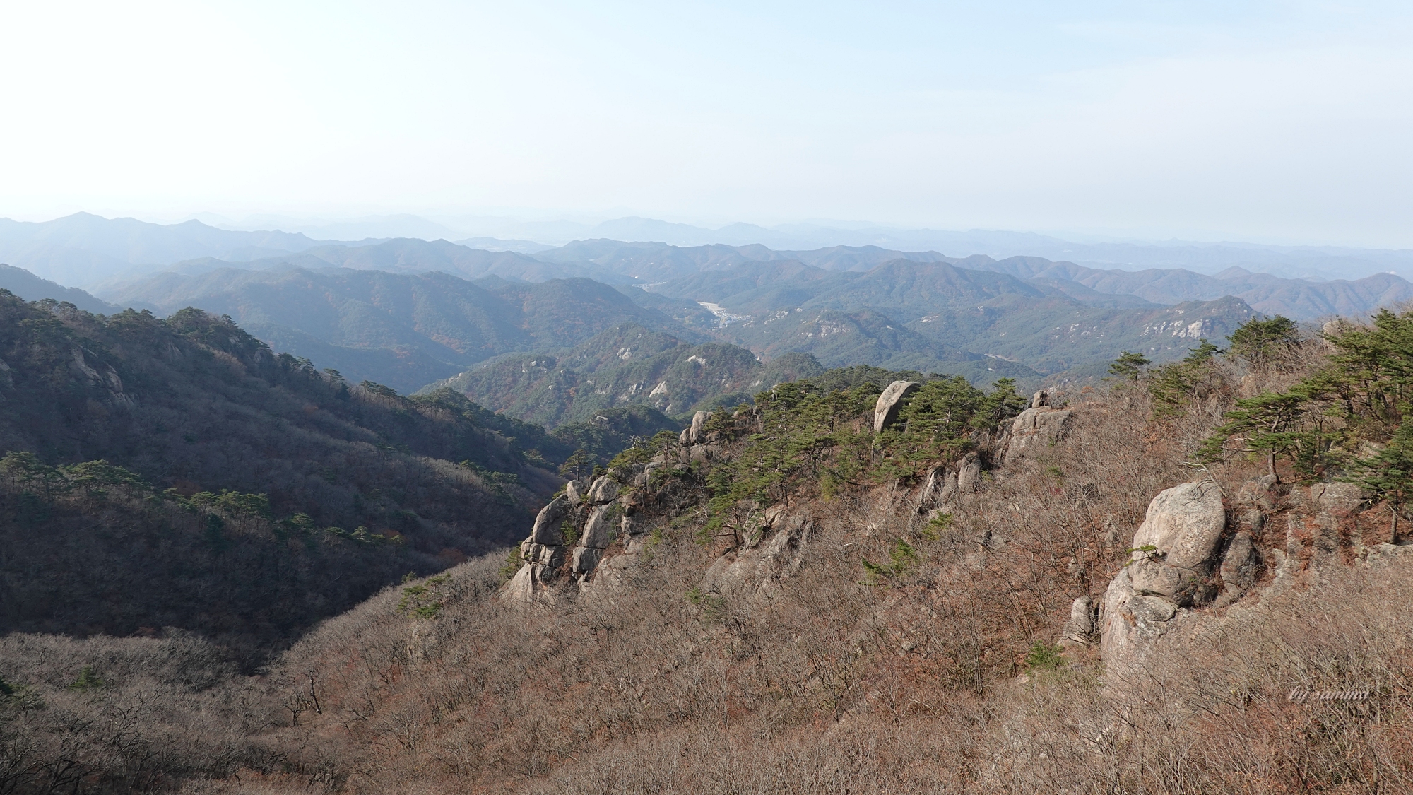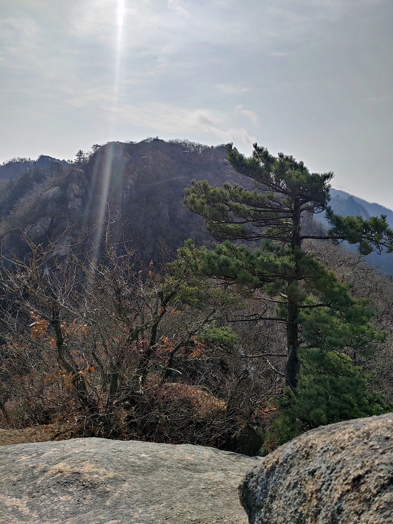 게다가, 동쪽 햇살 아래로 천황봉까지의 능선은 빛의 산란에 가려져있다.